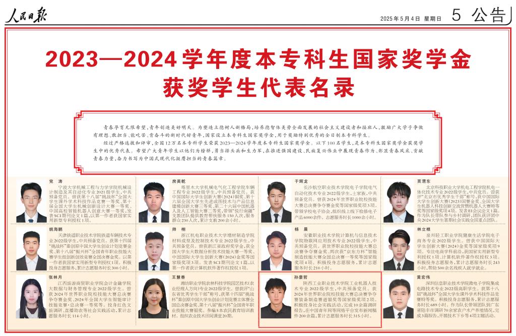 工业机器人技术专业2022级学生孙豪哲荣登《人民日报》国家奖学金获奖学生代表名录
