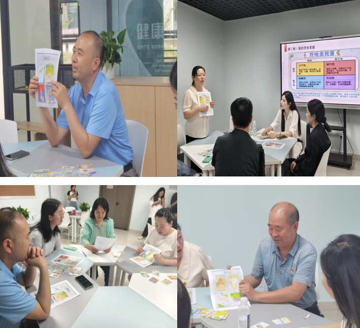 活动以“放松按摩操”“桃花朵朵开”等趣味破冰游戏拉开序幕,教师们通过肢体互动迅速打破隔阂,现场氛围轻松热烈。在“OH卡与心灵探索”环节,教师们通过随机抽取的图卡展开自我剖析。在主体活动“乔哈里窗”中,教师们抽取四张OH卡牌,分别对应“公开的我”“盲点的我”“隐藏的我”与“潜力的我”,并通过小组讨论展开深度探索。随着小组分享的深入,教师们逐渐敞开心扉,在倾听与共鸣中建立起情感联结。卡牌成为打开心门的钥匙,帮助教师重新审视自我认知与他人评价的差异。