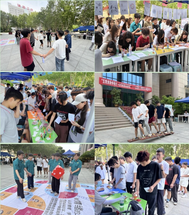 活动现场分为“签到打卡区”“一站一品展示区”“五育润心活动区”三大区域。在“签到打卡区”,同学们通过签名或画手印的方式完成签到,并领取“通关文牒”参与后续活动;“一站一品展示区”展示了各二级学院精心制作的心理主题展板以及现场互动小游戏,内容丰富,形式多样;“五育润心活动区”则围绕德、智、体、美、劳五大主题,设计了多项趣味心理游戏,让学生在游戏中感受五育融合的魅力。在“德润心田”活动区,同学们在“情绪飞行棋”中通过双脚跳跃释放压力,在“一穿到底”团队游戏中体验协作的快乐;“智启心灵”活动区的“超级汉诺塔”和“心灵迷宫”游戏挑战了同学们的逻辑思维与团队默契;“体健心晴”活动区在渭城和经开校区分别设置了“大脚板”“一箭倾心”投壶活动,让同学们在运动中收获团队协作的品质和快乐;“美育心窗”活动区的曼陀罗绘画和“自然疗愈九宫格”探索活动,引导同学们用艺术和自然疗愈心灵;最受欢迎的要数“劳筑心桥”活动区的非遗漆画书签DIY,同学们排起长队,迫不及待地想亲手制作属于自己的书签,大家小心翼翼地运用漂漆工艺,创作出独一无二的属于自己的艺术品。