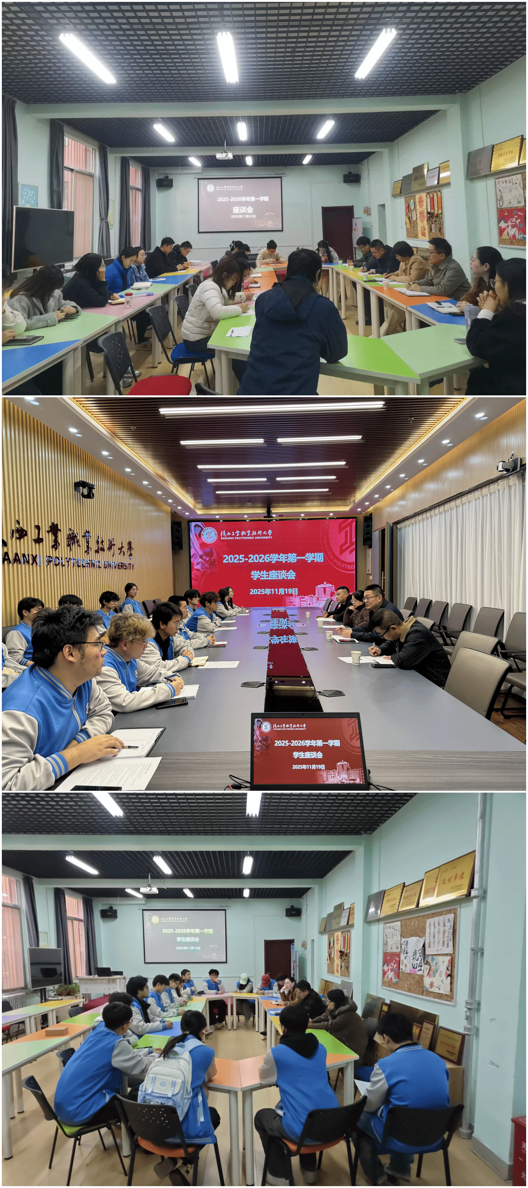 根据《关于开展2025-2026学年第一学期学生教育管理期中检查工作的安排》,学生处于11月19日分别在渭城校区、经开校区召开了学生座谈会,11月20日召开了辅导员、班主任座谈会,二级学院辅导员、班主任代表、学生代表以及学生处相关科室负责人等70余人分三场进行了座谈。