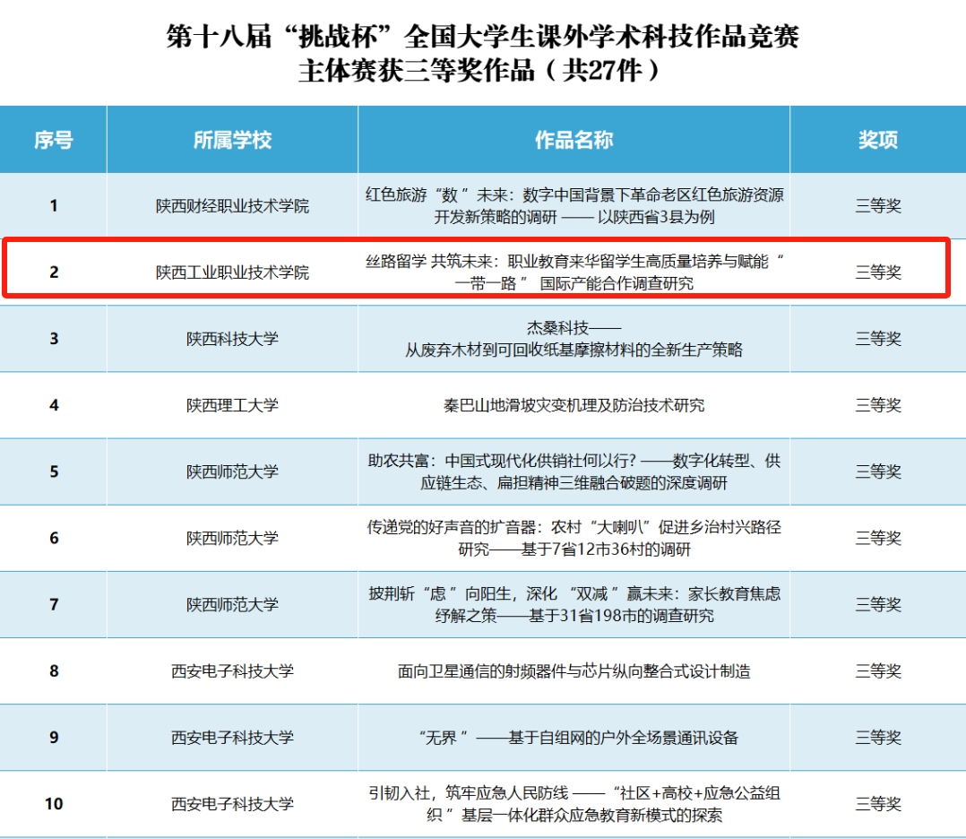 10月30日晚,由共青团中央、中国科协、教育部、中国社会科学院、全国学联和贵州省人民政府主办,贵州大学承办的第十八届“挑战杯”全国大学生课外学术科技作品竞赛终审决赛落下帷幕。我校国际教育学院选送作品《丝路留学共筑未来:职业教育来华留学生高质量培养与赋能“一带一路”国际产能合作调查研究》荣获主体赛三等奖。