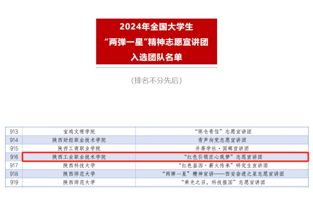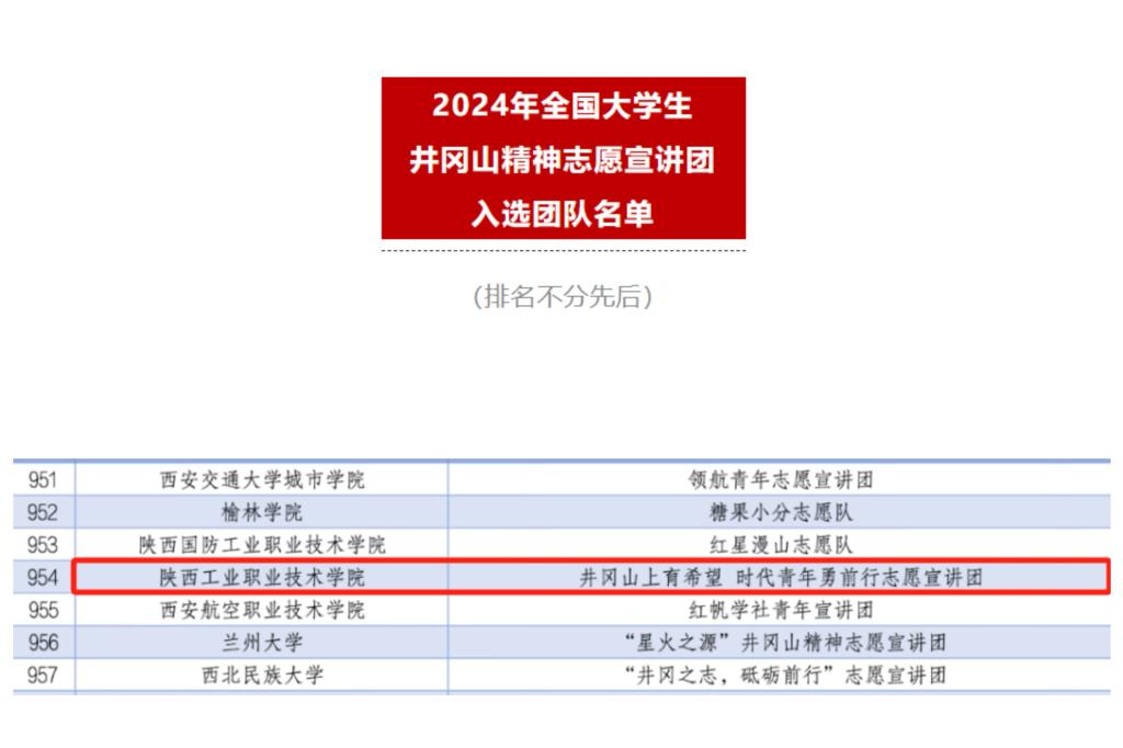 我校志愿宣讲团经自主申请、学校推荐、主办单位遴选等环节,马克思主义学院“秦马之声”理论宣讲团成功入选2024年全国大学生延安精神志愿宣讲团;材料工程学院“红色引领 匠心筑梦”志愿宣讲团成功入选2024年全国大学生“两弹一星”精神志愿宣讲团;汽车工程学院“井冈山上育希望 时代青年勇前行”志愿宣讲团成功入选2024年全国大学生井冈山精神志愿宣讲团。