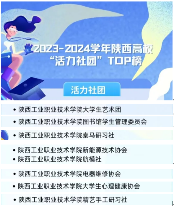为进一步激发高校学生社团活力,充分发挥学生社团育人功能,集中展现高校学生社团改革建设成果和典型经验,近日,在团中央基层建设部指导下,中国青年报社开展了2023-2024学年高校“活力社团”风采展示活动,我校大学生艺术团、图书馆学生管理委员会、秦马研习社、新能源技术协会、航模社、电器维修协会、大学生心理健康协会、精艺手工艺研习社八个学生社团入选2023-2024学年陕西高校“活力社团”TOP100榜,入选数量位居全省高校首位。
