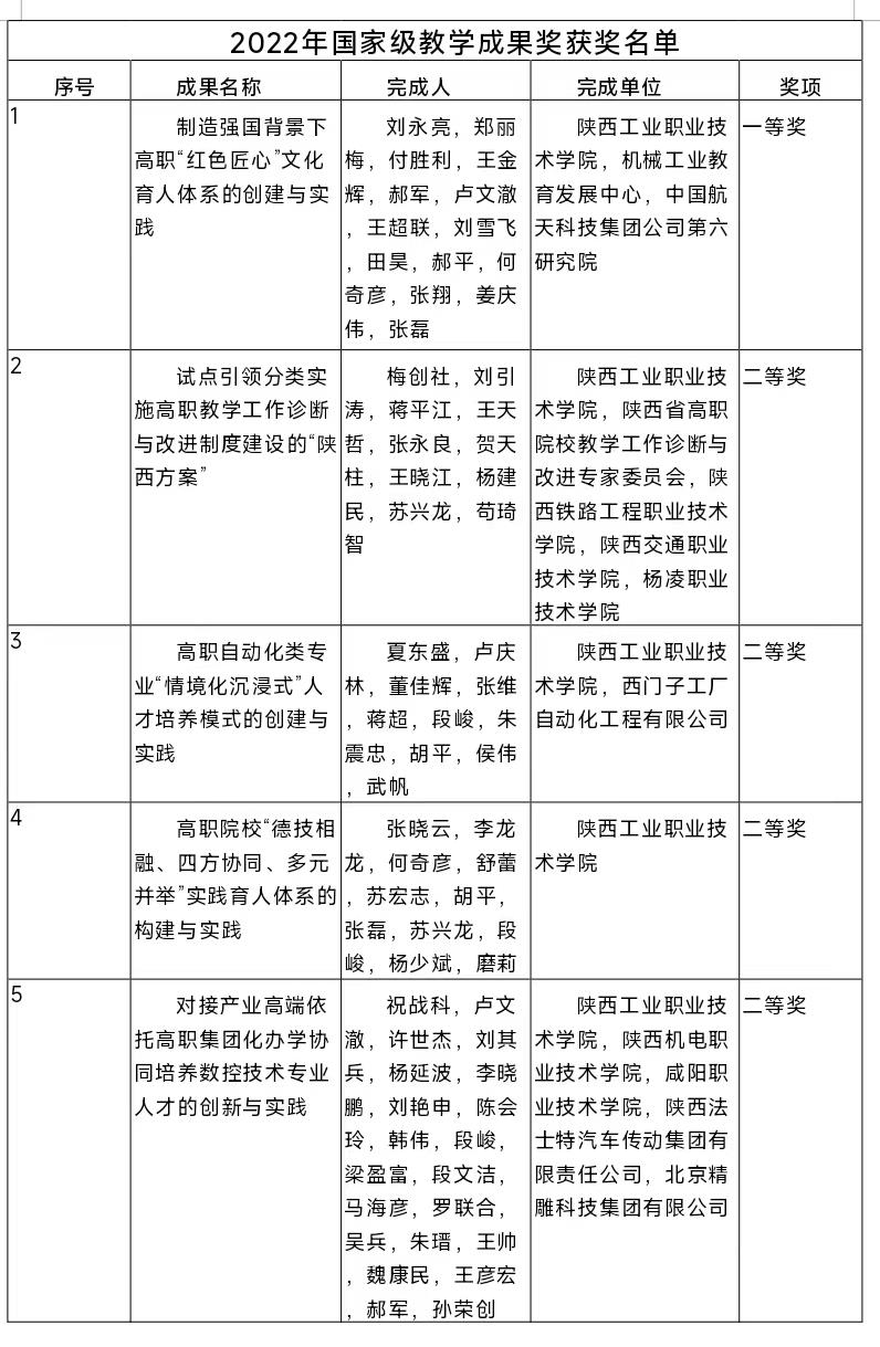 7月24日,2022年职业教育国家级教学成果奖获奖名单正式公布,乐游棋牌5项成果获国家级教学成果奖,其中一等奖1项、二等奖4项,取得新突破。其中,《制造强国背景下高职“红色匠心”文化育人体系的创建与实践》获一等奖,《试点引领 分类实施 高职教学工作诊断与改进制度建设的“陕西方案”》《高职自动化类专业“情境化沉浸式”人才培养模式的创建与实践》《高职院校“德技相融、四方协同、多元并举”实践育人体系的构建与实践》《对接产业高端依托高职集团化办学 协同培养数控技术专业人才的创新与实践》4项成果获二等奖。截止目前,学院共斩获国家级教学成果一等奖4项、二等奖7项,省级教学成果特等奖7项、一等奖11项、二等奖17项。
