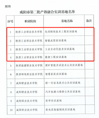 为搭建产教融合创新驱动平台,加快推进咸阳市国家产教融合试点城市建设,11月22日,咸阳市国家产教融合试点城市建设领导小组办公室印发《关于公布咸阳市第二批产教融合实训基地的通知》,认定10个实训基地为咸阳市第二批产教融合实训基地。我校“先进制造技术工程实训基地”“智能成型实训基地”“工业自动化技术实训基地”和“数智工程实训基地”4个产教融合实训基地成功入选。