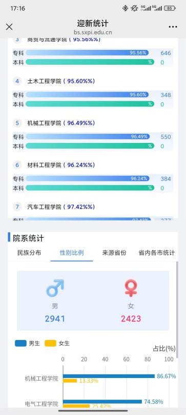 实时监控,精准统计。迎新期间,系统实现了新生报到进度的实时监控与多维度数据分析。通过动态生成总体报到率、累计报到人数、各院系及生源分布、民族、性别等多维度数据报表,并通过消息中心实时推送至管理人员微信及“云陕工APP”,为迎新工作提供了精准的数据支持。