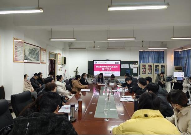 最后,新进的4位教师认真的阅读了《陕西工业职业技术学院教师师德师风承诺书》,并在承诺书上郑重签字。他们承诺,在工作中严格要求自己,严守教师师德底线,加强自我修养,规范职业行为,自觉增强立德树人、教书育人的荣誉感和责任感,学为人师,行为世范,努力做一名有理想信念、有道德情操、有扎实学识、有仁爱之心的“四有”好老师。