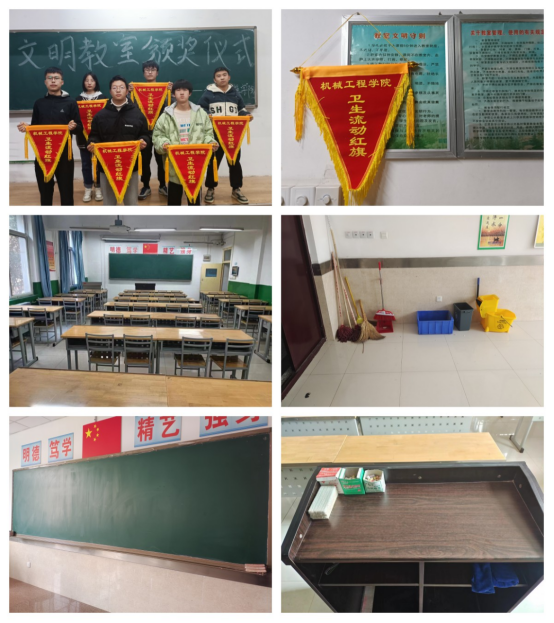 教室是学生学习文化知识的主要场所,干净整洁的教室环境有助于同学们更加愉悦地投入到学习中,教室里,地面干净,公物摆放整齐有序,板报无抹痕,门窗干净明亮,精心的设计、丰富的图文、鲜艳的色彩、深刻的寓意,小小的墙面经学生之手焕发出巨大的教育效果,形成了“班班有特色,处处显文化”的育人环境,真正打造了“窗明几净,静室寻梦;悉心教导,授业解惑”的教室氛围。活动中,机械学院学工办秉持公平、公正的原则,对照《评比细则》,对每间教室进行了详细的检查,最后现场打分,评出了6个“文明教室”,并发放了流动红旗以此鼓励。