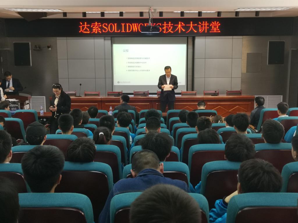 为进一步学习和领会党的二十大报告中关于“实施科教兴国战略”的内容,增进同学们对制造业未来发展趋势的了解,普及数字化智能化生产概念,制定符合行业发展需要的职业规划,立志成为社会主义现代化国家的建设者和践行者,4月26日下午,机械工程学院党总支特邀达索SOLIDWORKS公司大中国区教育资深顾问王天虎和西安亿信中久电子信息技术有限公司总经理陈阳在笃学楼B一层继续教育学院报告厅开展主题为“创新赋能教育,数字改变未来”文化大讲堂,机械学院党总支书记苏宏志、院长赵明威、教师代表、学生代表共120余人参加了讲座。