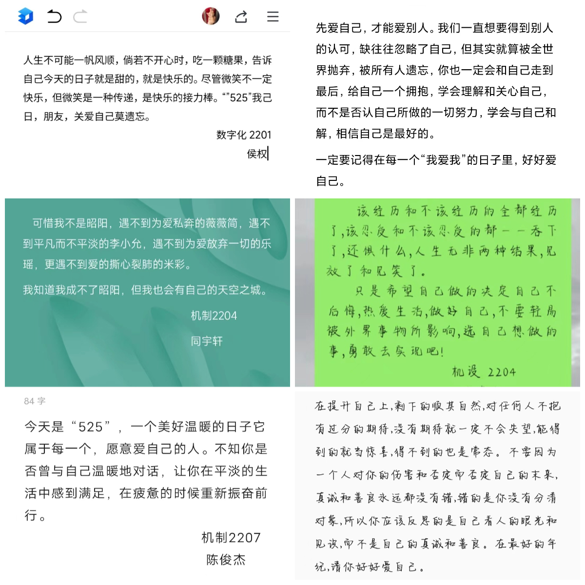 爱就大胆说出来。机械工程学院阳光心晴工作站组织此次活动,让同学们在自己手机备忘录里写上对自己或者对身边亲人的祝福语,表达了对朋友的想念与关心、对老师的感激、对英雄的敬意以及对自己的“表白”……每一份作品都记录了同学们最真挚的感情,让大家感受到爱的温暖,亲情的陪伴,也让同学们通过活动纾解心晴,畅谈友情。
