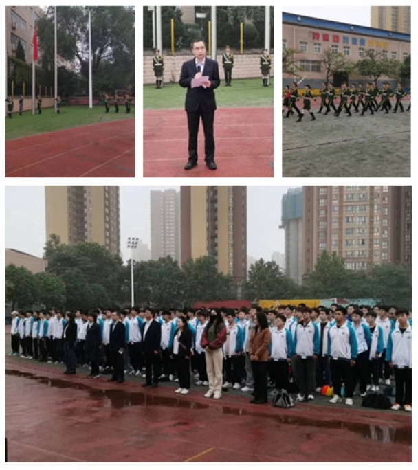 迎着初升的朝阳,国旗护卫队队员迈着铿锵的步伐护送五星红旗走向升旗台,伴随着庄严的国歌声,五星红旗冉冉升起,全体师生肃立,行注目礼。