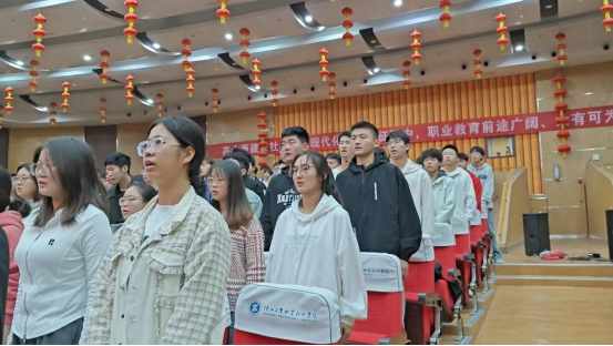 开学典礼在庄严的国歌声中拉开序幕,参加开学典礼的600余名2023级新生与全体老师同声高唱《中华人民共和国国歌》。