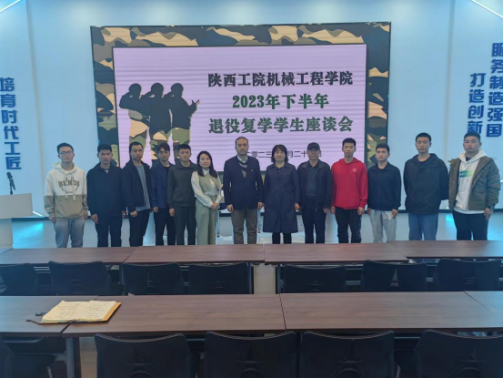 郭书记肯定了同学们从戎报国的勇气和魄力,希望他们能够继续发扬吃苦耐劳、坚韧不拔的精神,在学校加强学习、强身健体,坚守军魂军纪,顺利完成大学学业。刘老师也向大家分享了自己的军旅生涯,对同学们提出了永葆军人本色,勇担时代重任的期望。最后,何老师介绍了学院面向退役复学学生的各项服务和指导工作,并向退役复学同学们发出号召,希望同学们能够退伍不褪色,在学院需要之时冲锋在前,共同推进机械学院建设发展。