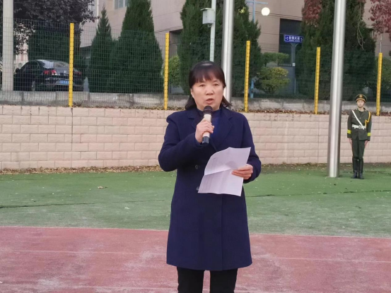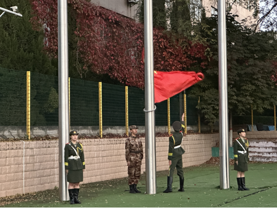 冬风渐起,寒意愈浓。国旗护卫队迈着矫健的步伐护送鲜艳的五星红旗入场,伴随着庄严的《义勇军进行曲》,五星红旗冉冉升起,全体师生肃立凝视,高唱国歌。