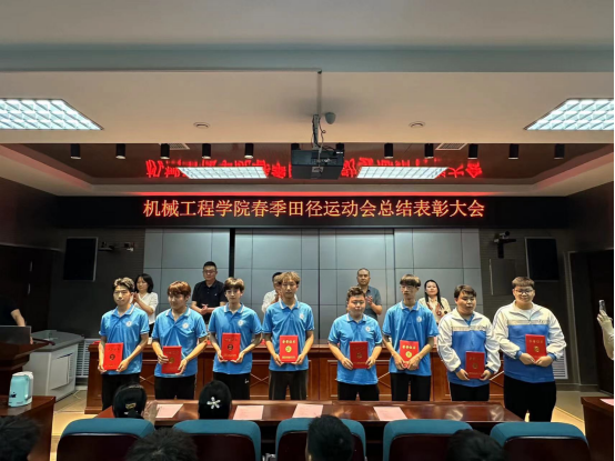 学院领导为先进个人和先进班集体颁发了荣誉证书。随后,五位学生代表依次上台发言,同学们表示,运动会期间虽然贡献了精力与汗水,但也学会了友爱、团结和理解,我们将继续前行,发扬机械学子的风采,知机识变,利械报国!