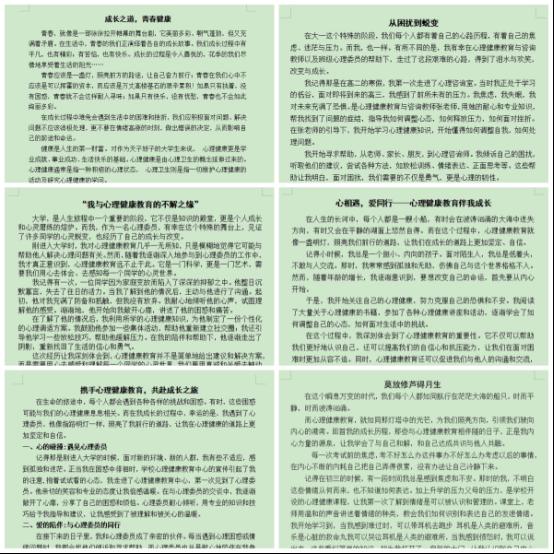 经过认真评比,机制2302班刘明培的《从困扰到蜕变》、机制2210班薛一飞的《心路历程:与心理健康教育的故事》荣获一等奖;机电设备2201班尹伦涛的《携手心理健康教育,共赴成长之旅》、机设2301班吴彤的《我与心理健康教育的不解之缘》、机制2209班杨力学的《心相遇,爱同行》3篇作品荣获二等奖;机制2302班刘亚刚的《莫放修芦碍月生》、机设2203班段乐乐的《成长之道,青春健康》等5篇作品荣获三等奖;其余部分作品荣获优秀奖。