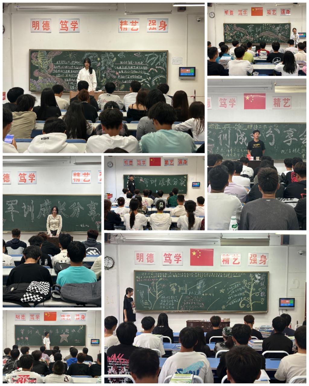 各班班主任首先对同学们在军训中展现出的顽强意志和团队精神表示赞扬,并鼓励大家将军训中培养的优秀品质延续到今后的学习和生活中。接着,同学们积极上台分享自己在军训中的点点滴滴,有的同学讲述了自己在军训中如何克服身体不适,坚持训练的感人故事;有的分享了与同伴们一起面对挑战,共同进步的难忘经历;还有的表达了对教官严格训练的感激之情以及对军训生活的不舍。在分享中,听到了许多感人至深的话语:“军训让我学会了坚持和忍耐,每当我想要放弃的时候,是身边的战友给了我力量。”“军训虽然辛苦,但它让我明白了团队合作的重要性,一个人的力量是有限的,但一个团队的力量是无穷的。”班会的亮点是“军训风采展示”环节。同学们通过照片、视频等形式,回顾了军训期间的点点滴滴。一张张照片记录了学生整齐划一的步伐,一段段视频展现了学生铿锵有力的口号。最后班主任老师对班会进行总结。强调军训是大学生活的重要一课,它不仅锻炼了我们的身体,更重要的是锻炼了我们的意志和品格,希望全体学生能够将军训中的精神内化于心、外化于行,在未来的学习和生活中不断追求卓越。