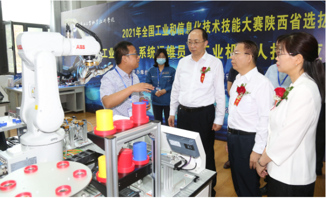 该赛项竞赛内容由理论考试和实践操作两部分组成,总成绩中理论考试占20%,实践操作占80%。赛项按照工业机器人系统运维员国家职业技能标准要求实施,同时结合现代企业生产实际和工业机器人技术应用发展状况命题,重点考察参赛选手对工业机器人工作站或系统进行方案规划、系统集成、运行维护、状态监测、故障分析与诊断处理的理论和技术水平。赛场内全程视频监控,由裁判专家组、监督仲裁组和技术组成员组织比赛,确保赛程严谨、公平、公正。比赛期间,校党委书记惠朝阳、副校长梅创社陪同陕西省工业和信息化厅相关领导到竞赛现场进行检查督导。