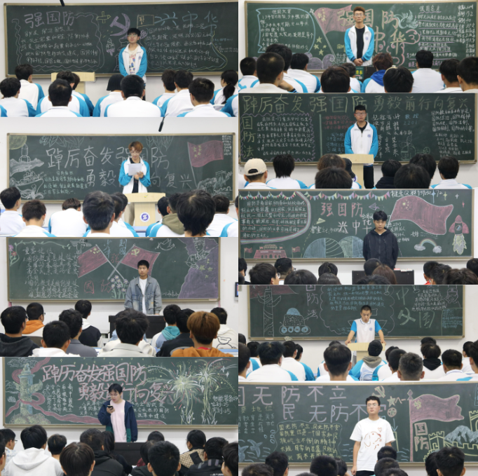 班会前期,航空学院以班级为单位,提前仔细准备国防教育主题黑板报。班会开始,各班班长宣读国防建设与国防动员相关知识,向同学们讲述目前我国国防建设取得的成就,以及当前全民国防教育存在的矛盾问题与意见建议。在主题班会的学习中,同学们明确了大学生应承担的国防义务,并分组讨论分享自己所了解的国防故事。最后,由班长进行总结,倡议同学们自觉履行国防义务,从身边小事做起、严以律己,关心、支持、参与国防建设。