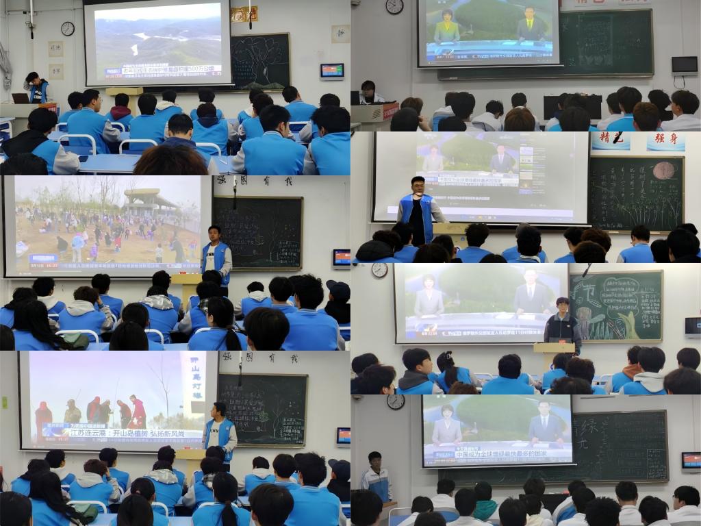 班会伊始,各班学生集体观看了环保短片《一棵树的使命》。短片展示了树木在调节气候、涵养水源、维护生物多样性等方面的重要作用,引发同学们对生态保护的深刻思考。各班班长向同学们讲解了中国植树节的由来与发展历程,从古代“清明插柳”的习俗到1979年法定植树节的设立,再到“三北防护林”“蚂蚁森林”等国家政策与社会创新实践,展现了我国在植树造林领域的卓越成就。并特别强调了中国在全球生态治理中的贡献。截至2023年,中国人工林面积达13.14亿亩,居世界首位,并贡献了全球25%的新增绿化面积。这些数据让同学们深感自豪,也进一步认识到青年一代肩负的责任。