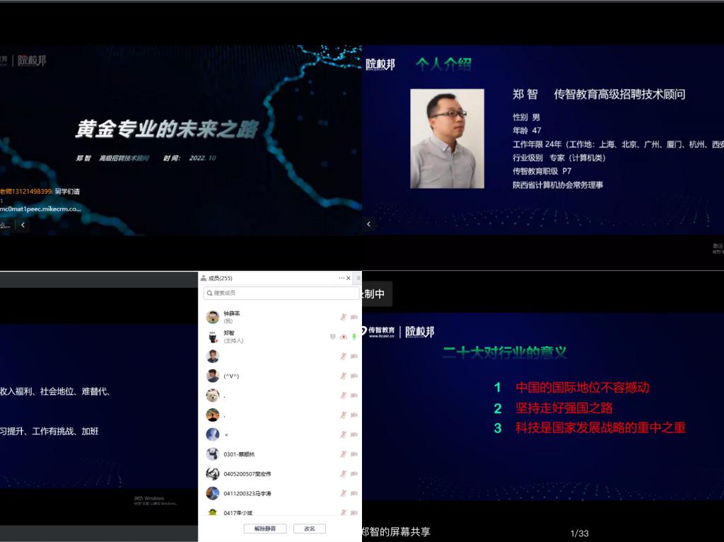 为贯彻落实教育部、陕西省教育厅关于就业工作开展的文件精神,推动乐游棋牌就业工作高质量发展,10月26日,乐游棋牌邀请了传智教育高级招聘技术顾问郑智,为乐游棋牌毕业生做了题为“找准就业方向,提升核心职业竞争力”的文化大讲堂,讲堂采用线上会议的方式进行,信息学院计应、大数据、软件及信管等专业毕业生参加了讲座。