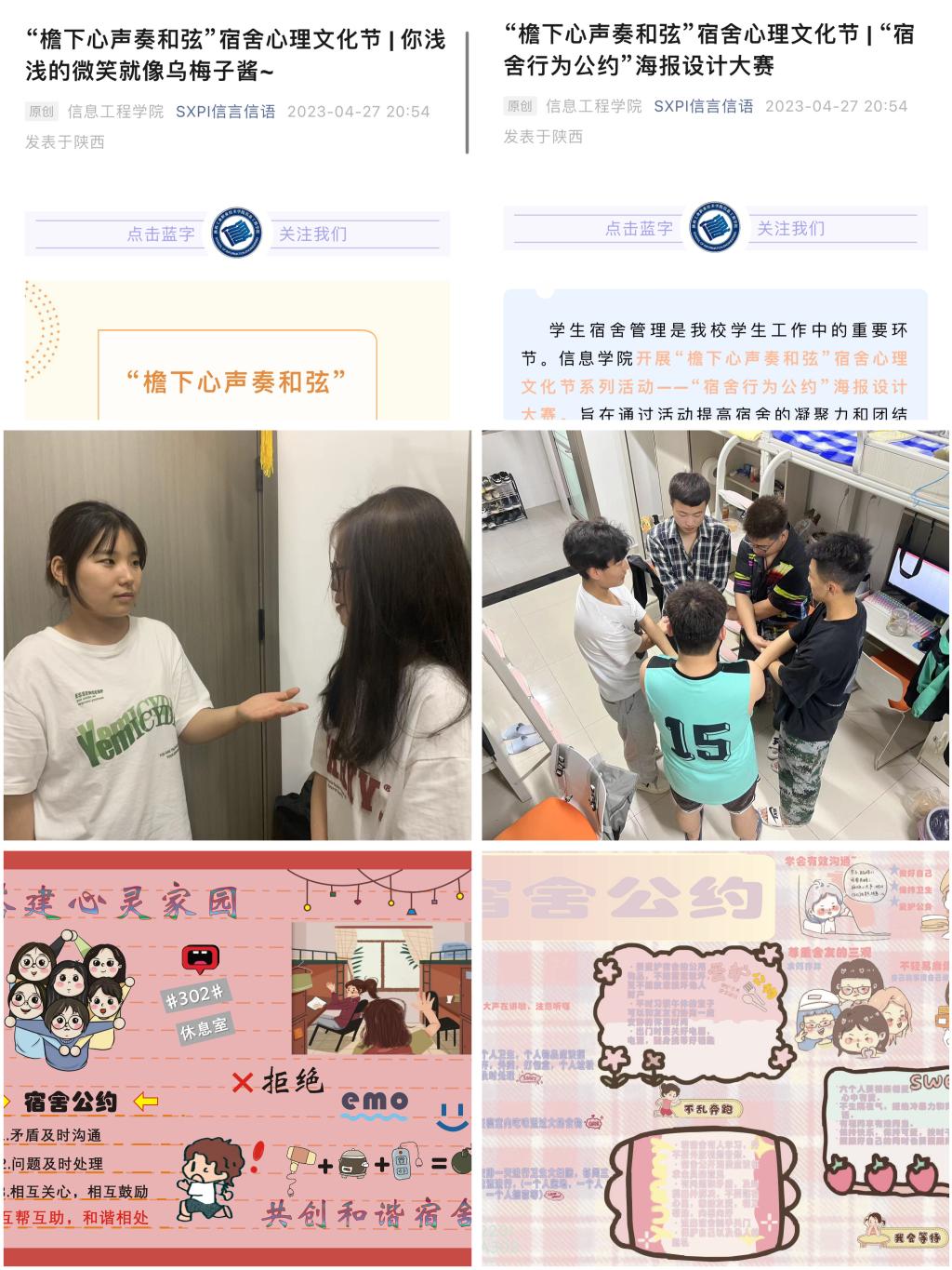 在“心理健康进宿舍”宣传教育活动中,辅导员、学生干部和学生党员深入宿舍开展“常见心理问题疏导”“心理危机预防”主题宣讲,推动心理健康教育与大兴调查研究紧密结合。在“寝室遇见爱”实践活动中,学生通过“相‘寓’是福”“知你知我”“戴高帽儿”等特色游戏,学会了互相欣赏和换位思考。“浅浅的微笑就像乌梅子酱”宿舍集体微笑摄影展选取并纪录了学生宿舍生活的开心瞬间,展示宿舍最温馨的一面。“宿舍行为公约”海报设计大赛要求各宿舍制定行为公约,帮助学生以公约形式规范自身的行为举止,营造健康的宿舍氛围。