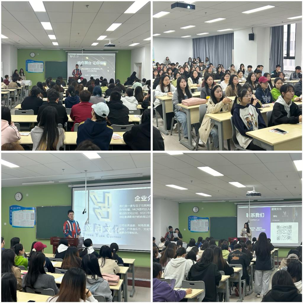 活动中,张嘉欣从文化传媒行业的现状与发展趋势、行业热门岗位介绍、如何进入文化传媒行业、以及如何提升个人职业竞争力四个方面进行了详细讲解。她结合自身多年的从业经验,向同学们分享了文化传媒行业的最新动态、企业招聘需求以及职业发展路径。她特别强调了创新思维、团队协作和跨学科能力在文化传媒行业中的重要性,并鼓励同学们在校期间积极参与实践项目,积累经验,为未来就业打下坚实基础。在互动环节,同学们踊跃提问,围绕文化传媒行业的职业发展、技能要求以及实习机会等问题展开了深入交流。盛阳文化传媒的几位资深员工也结合自身经历,为同学们提供了宝贵的建议,现场气氛热烈。