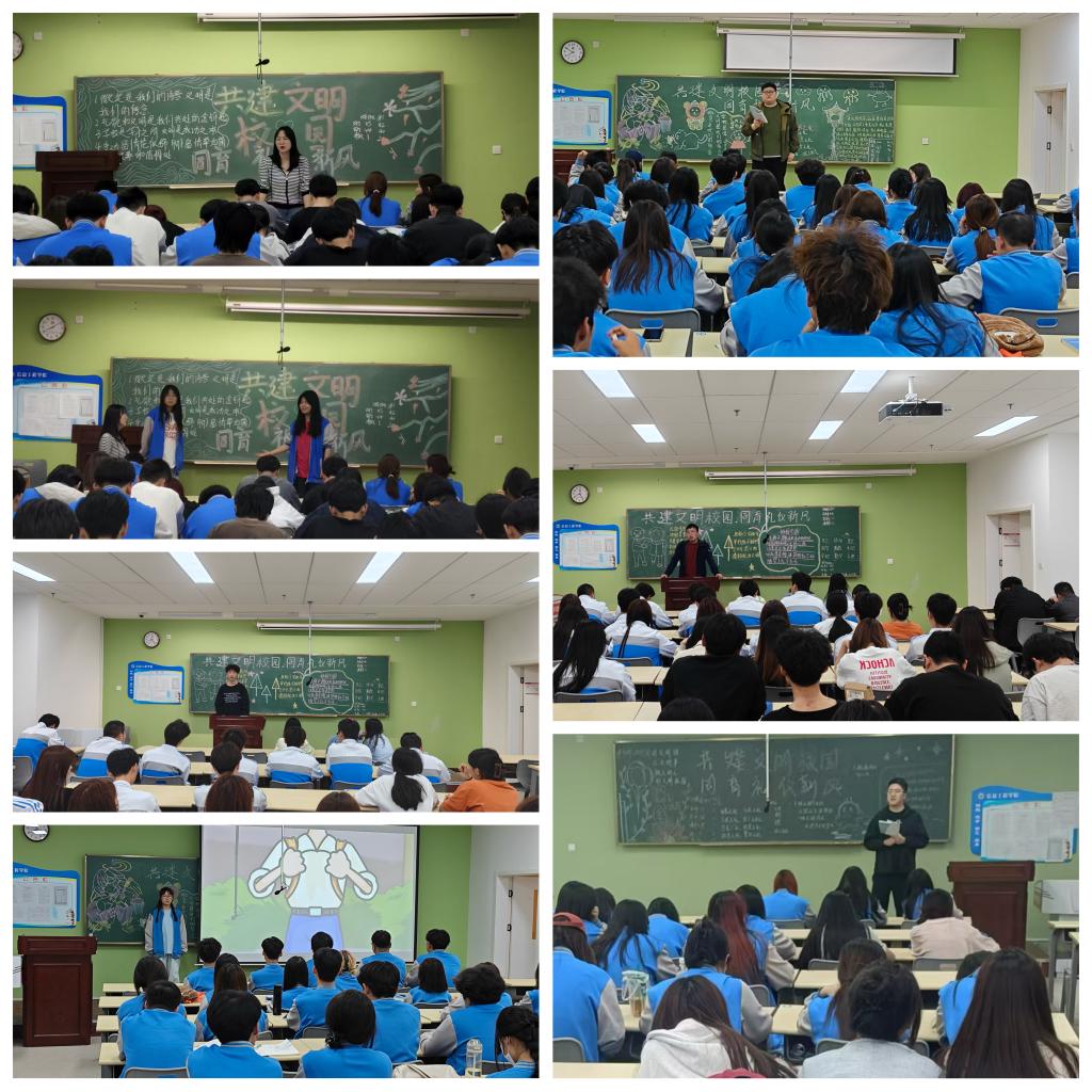 班会上,各班辅导员、班主任首先结合校园生活实例,强调了文明礼仪的重要性,并围绕课堂纪律、宿舍卫生、公共场合行为规范等提出具体要求,引导同学们以此次班会为起点,自觉践行文明规范,争做校园文明的倡导者和示范者。随后,各班学生代表依次上台发言,利用视频分享、个人讲解、现场演绎等方式分享自己对文明礼仪的理解和实践经验,同学们积极参与讨论,现场气氛热烈。大家纷纷表示,将从自身做起,注重言行举止,为创建文明校园贡献力量。