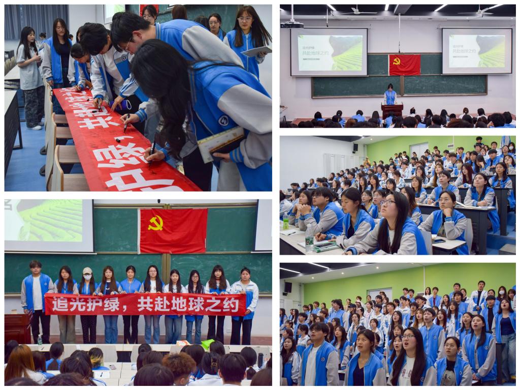 活动伊始,信息学院学生第一党支部通过知识普及与视频学习,系统阐释了绿色发展的内涵与时代意义,引导同学们深刻认识生态文明建设的紧迫性。在“环保清单”环节,大家围绕节约用电、减少浪费等主题展开讨论,制定具体行动方案,并通过集体宣誓承诺将环保理念融入日常学习生活。活动现场还组织横幅签名仪式,与会同学在“追光逐绿 共赴地球之约”的横幅上郑重签名,以行动彰显责任担当。
