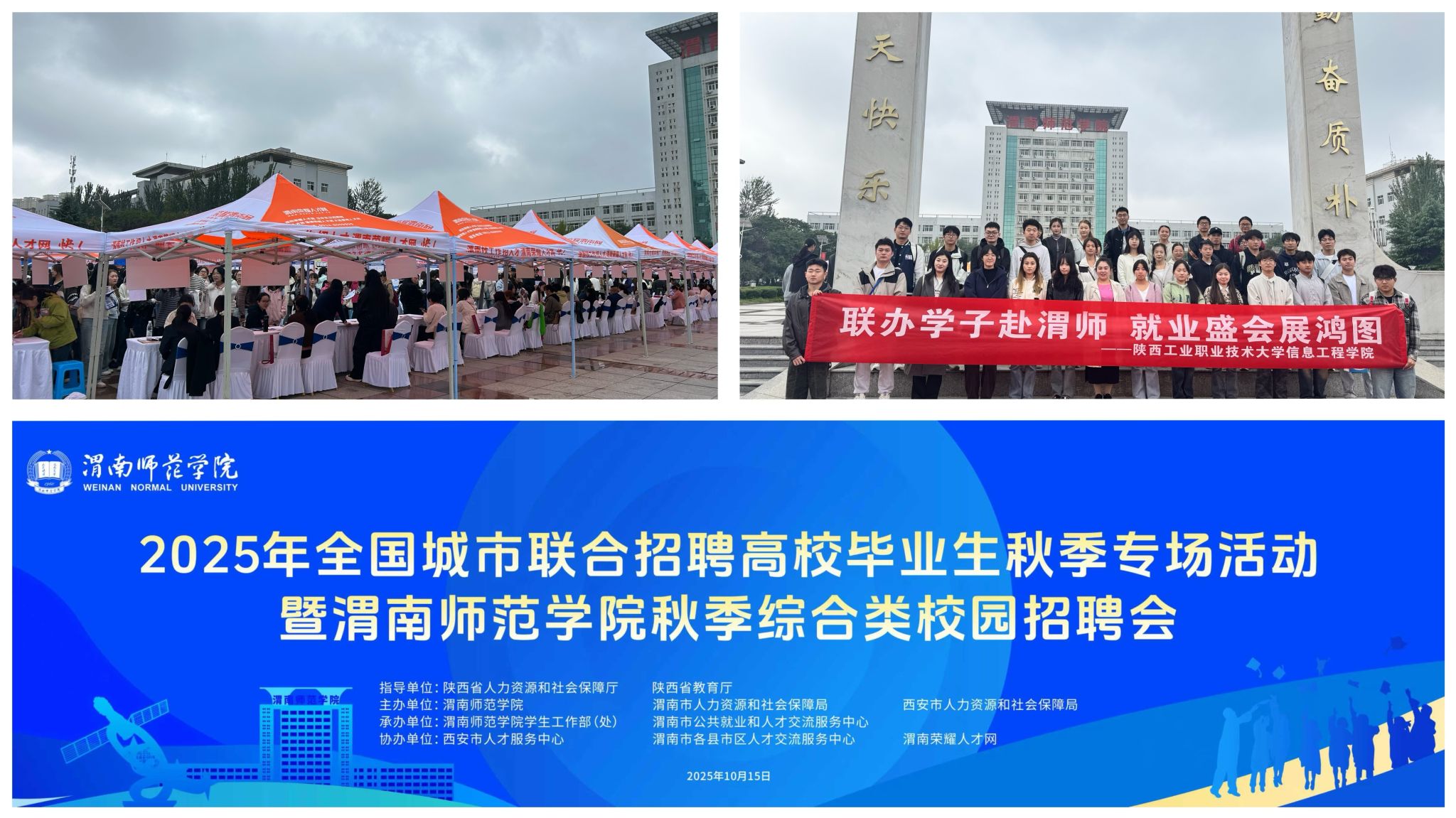 为深入贯彻落实教育部关于高校毕业生就业工作的决策部署,扎实推进我校与渭南师范学院联合培养2026届本科生的就业服务工作,10月15日,信息工程学院精心组织计算机2241班45名联办本科学生,由学院统一安排专车护送,前往渭南师范学院参加“2025年全国城市联合招聘高校毕业生秋季专场活动暨渭南师范学院秋季综合类校园招聘会”。