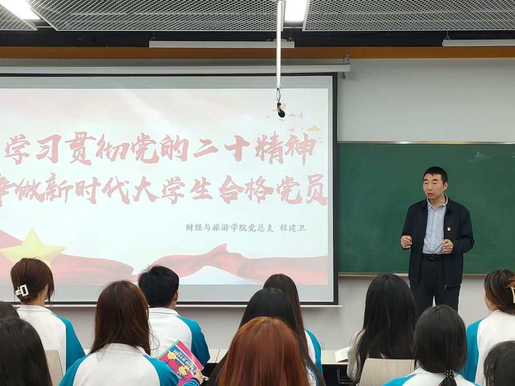 为深入贯彻落实党的二十大精神,结合学习贯彻习近平新时代中国特色社会主义思想主题教育,加强对入党积极分子的培养、教育和考察,切实提高入党积极分子的政治素养、理论修养和思想觉悟,确保新时代党员发展和教育工作实效。4月27日晚,财经与旅游学院党总支副书记程建卫为67期积极分子讲授《学习贯彻党的二十大精神,争做新时代大学生合格党员》的专题党课。