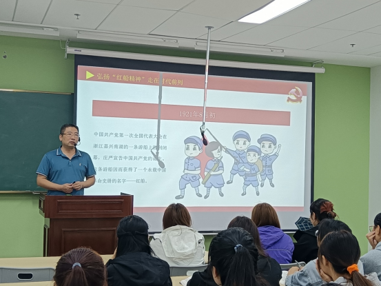 “红船精神”的内涵指的是开天辟地、敢为人先的首创精神,坚定理想、百折不挠的奋斗精神,立党为公、忠诚为民的奉献精神,是中国革命精神之源。 在庆祝中华人民共和国成立74周年之际,财经与旅游学院老师第一党支部于第四周开展“红船再出发”主题党日活动。活动由授课教师将“红船精神”带入课堂,向全体学生进行宣讲。活动从走在时代前列、党的先进性之源、具有重要意义、继承和弘扬四个方面向学生们介绍“红船精神”,红船所代表和昭示的是时代高度,是发展方向,是奋进明灯,是铸就在中华儿女心中的永不褪色的精神丰碑。“红船精神”同井冈山精神、长征精神、延安精神、西柏坡精神等一道,伴随中国革命的光辉历程,共同构成我们党在前进道路上战胜各种困难和风险、不断夺取新胜利的强大精神力量和宝贵精神财富。