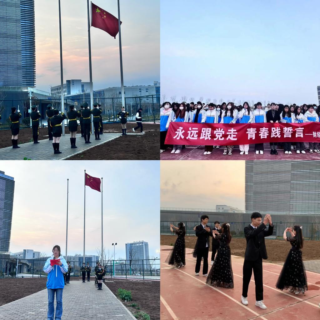 6点50分,升旗仪式正式开始。迎着初升的朝阳,国旗护卫队护送鲜艳的五星红旗走向升旗台,伴随着庄严的国歌声,全体师生昂首肃立,向国旗行注目礼。升旗仪式结束后,首先由会计2303班刘文丽同学作为学生代表进行国旗下的演讲,她号召同学们要将个人的理想追求融入国家和民族的事业中,勤奋学习,努力提高自己的科学文化素质和综合素质,用青春践行自己的初心与誓言。随后,财经学子身穿华服,在优雅的旋律中带来舞蹈——青春华尔兹串烧,展现财经学生多元才艺,为整个活动增添了一抹青春的气息。