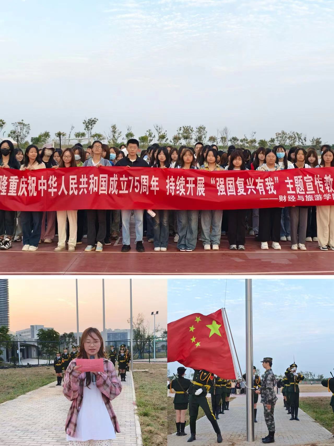 9月23日清晨,阳光初照,陕西工业职业技术学院财经与旅游学院举行庄严肃穆的升旗仪式,迎接庆祝中华人民共和国成立75周年,并以此为契机,持续开展“强国复兴有我”主题教育活动。这不仅是对过去辉煌成就的回顾,更是对未来发展的深切期许和坚定信心。