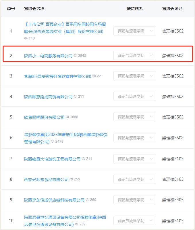 商贸学院积极联系就业指导处、校企合作处,指导用人单位利用云校招平台发布宣讲会信息15场次,协助用人单位发布宣讲会线下通知12场次,并通过就业指导处微信公众号进行精准推送。单次宣讲会网上浏览点击量最高达2843次。