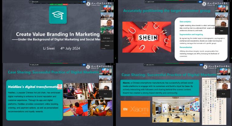 主讲教师李思维分别从品牌价值介绍、品牌价值的重要性、数字营销和社交媒体营销对品牌建设的作用等角度展开讲述,并结合电子商务专业近年来的科学研究、校企合作和乡村振兴经验,为印尼巴厘理工学院师生梳理了品牌价值建设的思路、路径和注意事项,并就中国知名品牌小米、海底捞和著名跨境品牌SHEIN的品牌建设历程进行了案例分析讲解,引起了师生们的极大兴趣。同时,讲座积极发挥对外传播效能,在课程内容中融入了中华优秀传统文化和习俗科普,向印尼巴厘理工学院师生展示了中国传统文化与民族品牌的融合共生。在介绍内容营销时,李思维老师展示的中国传统婚服案例一度将讲座气氛推向高潮。