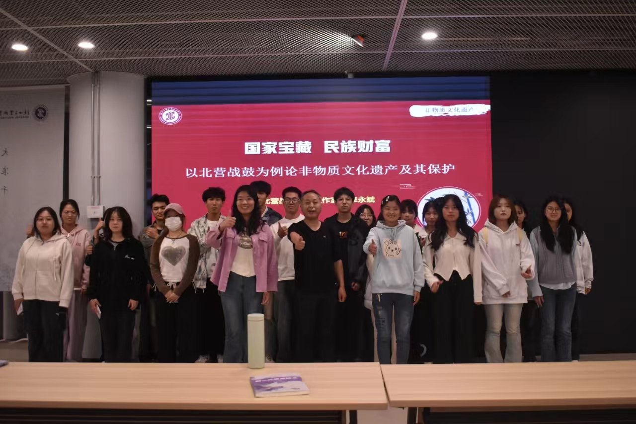 活动第三阶段,卓老师具体讲述了非遗项目北营战鼓的前世与今生。先是说明了北营战鼓发源地北营村村名的来源,然后回顾历史说明战鼓在古战场的实际应用。之后通过图片和实物展示,说明鼓队中具体每个乐器的发声特点和具体作用。最后,卓老师介绍了北营战鼓目前的传承现状并鼓励大家积极参与到非遗项目保护和传承的活动中来。参与活动的同学们兴趣盎然,认真听讲,积极提问和互动,现场气氛轻松祥和快乐。