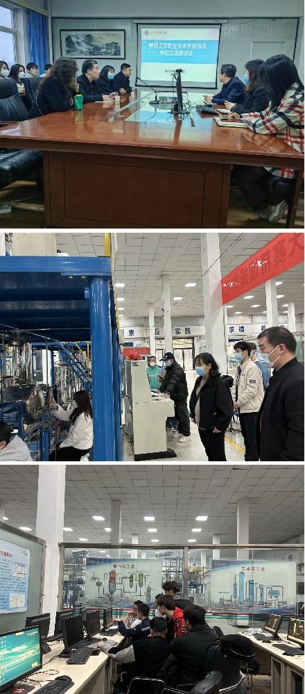 王化冰院长对王艳领主任一行的到来表示热烈欢迎,简要介绍了化工与纺织服装学院化工专业的师资力量、人才培养和实训基地建设等基本情况。王艳领主任介绍了重庆工贸职业技术学院健康学院的发展现状,并希望借鉴化工与纺织服装学院在技能大赛、实训基地建设和教学等方面的成熟经验和做法。刘迪副院长及骨干教师代表分别从师资队伍建设、人才培养方案和课程标准等方面进行了解读,随后大家进行了热烈讨论。会后,王艳领主任一行参观了化工实训中心。