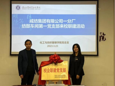 随后,在全体与会人员的共同见证下,咸纺集团第一党支部书记张栓平和化纺服学院教师党支部书记刘迪共同为校企联建党支部揭牌。