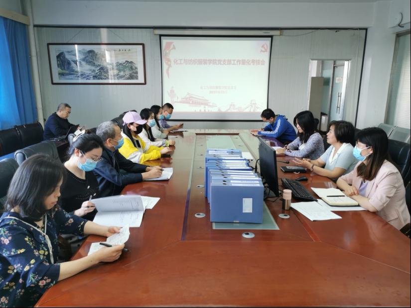 化纺服学院党总支对各支部思想政治建设、党风廉政建设、宣传组织、队伍建设等方面进行了综合考评。通过听取党支部书记的工作汇报、现场查阅基础资料、对照检查等方式进行了现场考核,将考核结果向各支部现场反馈,并提出了具体的整改措施和整改期限。