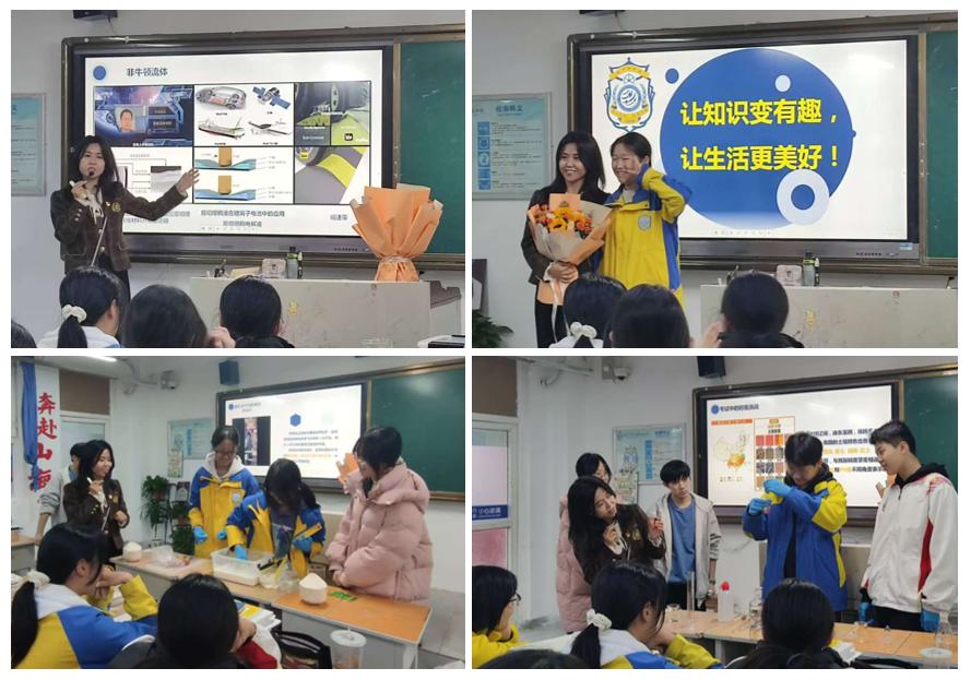 课堂上,刘迪副书记首先教育全体学生要热爱学习,用知识和技能增强自身的本领,努力成为新时代社会主义现代化建设者和接班人。随后,她利用“变色、魔术”等奇幻色彩词汇勾起同学们的好奇心,然后通过“色彩魔术”和“防弹衣的秘密”两大“魔术”实验,实地展示了化学中的酸碱显色现象和非牛顿流体特性。实验在2名大学生的协助下,由中学生们亲手完成。随后,刘迪副书记由现象抽离出科学本质,从理论的角度总结了这堂充满了智慧、思想和实践火光的化学课,并与生活实践相结合,带领同学们一步一步接近科学本质,走进科学天地。