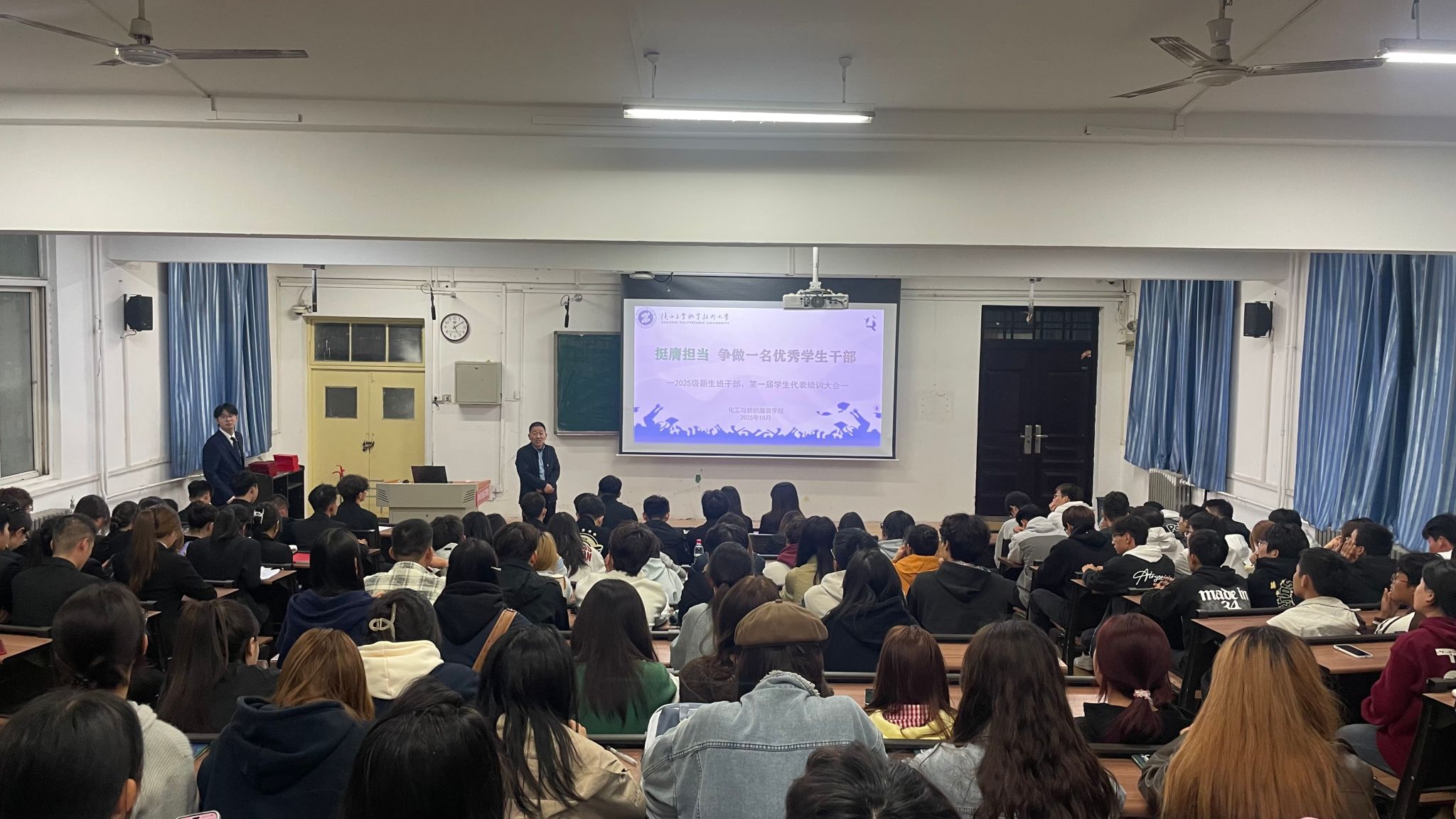 为加强学生干部队伍建设,提升新生班干部与学生代表的综合素质与履职能力,10月28日,化工与纺织服装学院在崇文北楼阶梯教室召开了2025级学生干部首次培训会。本次培训以“挺膺担当,争做一名优秀学生干部”为主题,围绕工作目标、方法、素质要求及校园安全等方面展开系统讲解,为新生干部尽快适应角色、有效开展工作奠定了坚实基础。本次培训由党总支书记杨修国担任首期主讲人,全体学生干部参会。