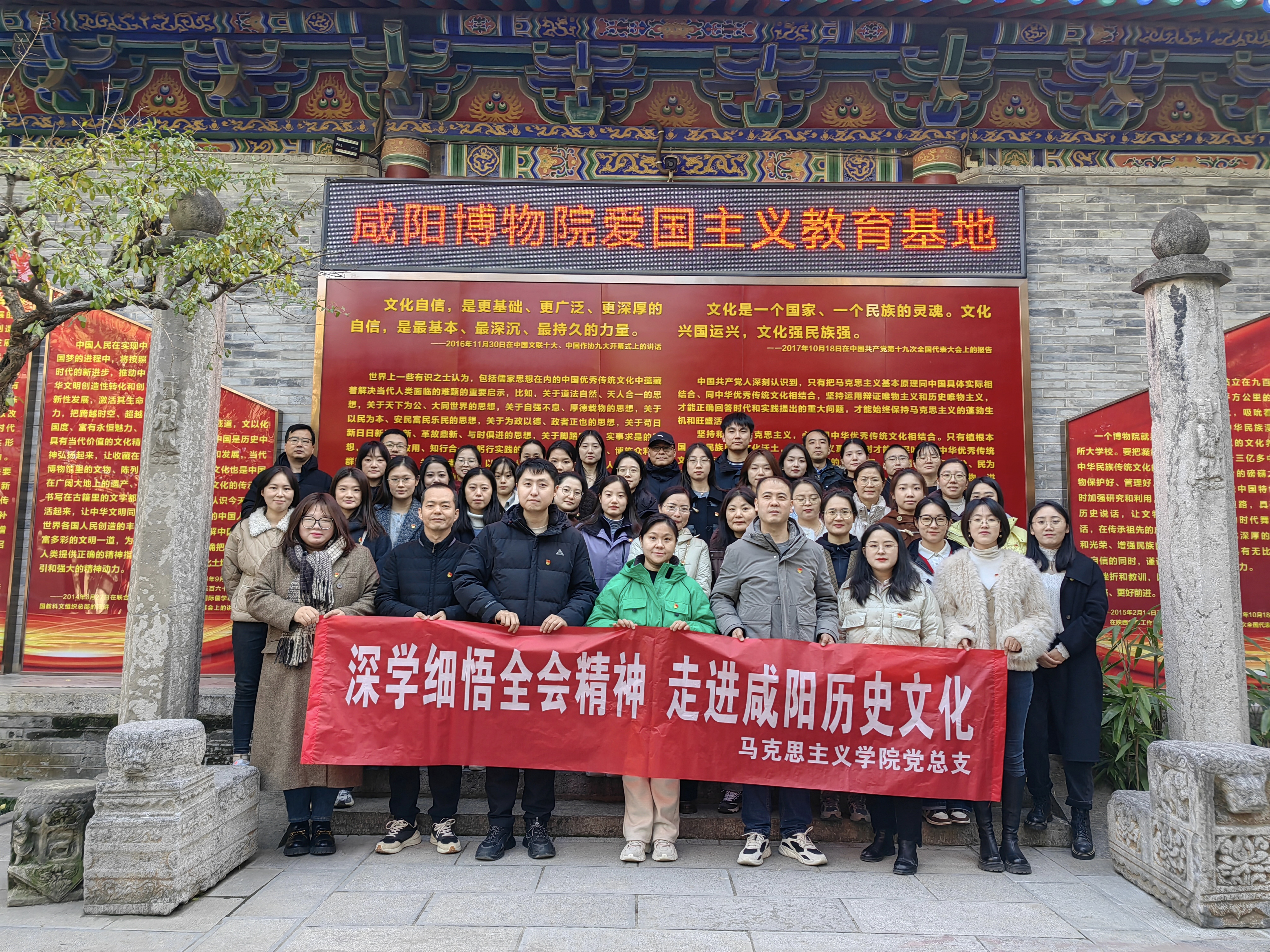 为丰富马院教师的知识储备,增进教师对陕西历史、地方特色的了解,帮助教师以史为鉴,厚植地域自豪感与听党话跟党走的责任心,激发育人成才的奋斗精神,11月28日下午,马院党总支组织下辖的新思想概论及毛中特概论党支部、德育及形势与政策党支部共计56名党员,赴咸阳博物院开展“深学细悟全会精神 走进咸阳历史文化”主题党日活动。