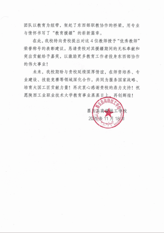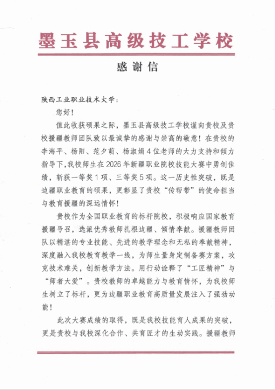 墨玉县高级技工学校在感谢信中特别提到,我校李海平、杨阳、范夕萌、杨淑娟4位教师在此前结束的2026年新疆职业院校技能大赛中,指导该校师生取得一等奖1项、三等奖5项的历史性突破。信中指出,陕工大援疆教师团队“以精湛的专业技能、先进的教学理念和无私的奉献精神,深度融入教育教学一线”,为边疆职业教育高质量发展注入了强劲动能。这封感谢信不仅是对援疆教师个人能力的肯定,更是对我校教育援疆工作整体成效的充分认可。