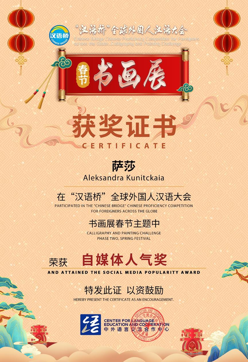留学生萨莎在“汉语桥”书画展春节主题中荣获“自媒体人气奖”