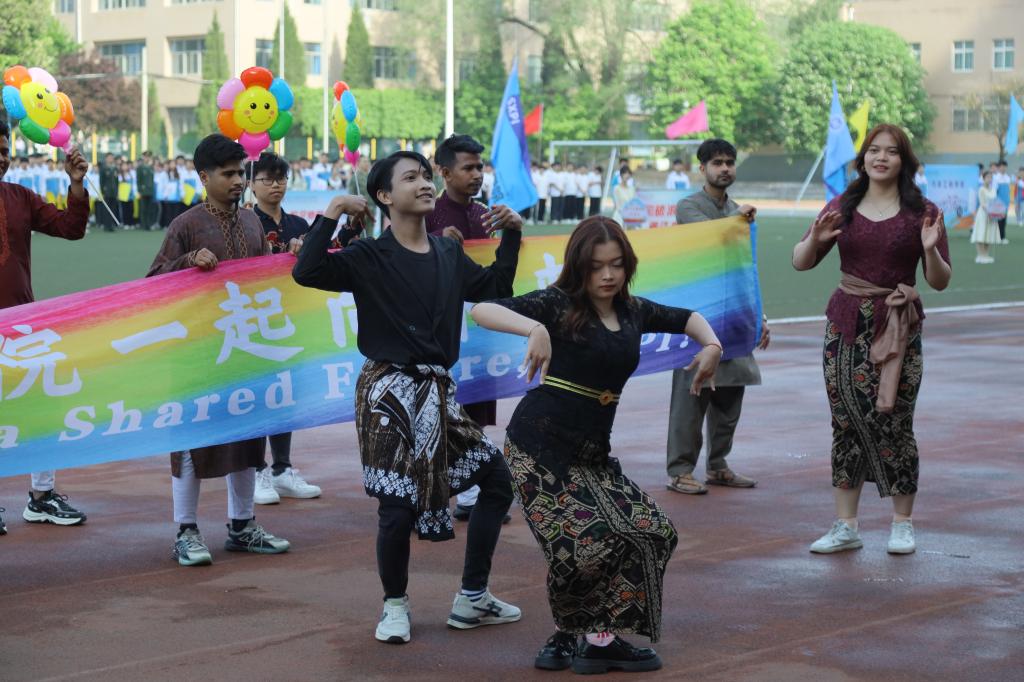 开幕式当天,留学生身着本国传统服饰,以饱满的精神与稳健的步伐步入主席台前。他们高举着带国际教育学院旗子,手拉五彩横幅“陕西工院一起向未来! Together for a Shared Future, SXPI!”,拿着笑脸气球高喊“我们爱你,陕工院!”。留学生以灿烂的笑容诉说着成为中外友好使者的追求与梦想,在主席台前演绎了印度尼西亚传统舞蹈,赢得现场掌声阵阵。