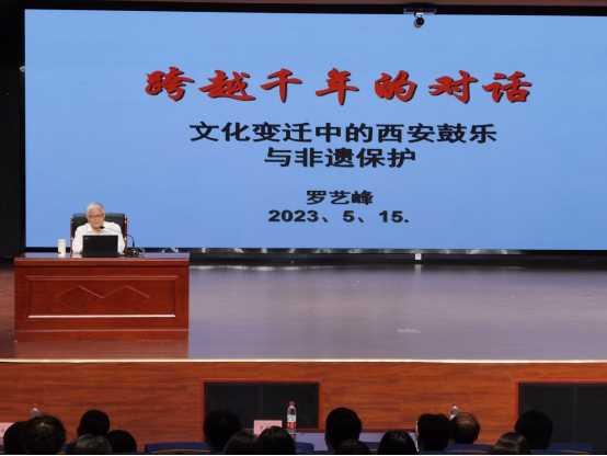 西安音乐学院(二级)教授罗艺峰为大家带来了专题非遗讲座——《跨越千年的对话:文化变迁中的西安鼓乐与非遗保护》。罗教授也是中国音乐学院博士生导师,国家有突出贡献专家、享受国务院特殊津贴,教育部学术学位评议专家,人文社科奖评审专家,长江学者评审专家。在讲座中,罗教授娓娓道来,从什么是非物质文化遗产,以及我国的非物质文化遗产的基本情况介绍讲起,生动形象地为大家讲述了西安鼓乐的起源与发展,并联系文化变迁理论和我国非遗传承保护政策,强调保护、学习、传承这一珍贵历史遗产的价值和意义。非遗文化不仅代表着中华民族的文化根脉,它蕴含的思想观念和人文价值也滋养了我们中国人的精神土壤。