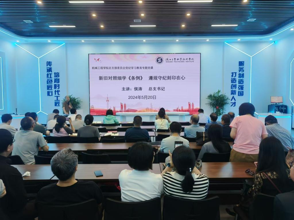 5月20日,机械工程学院党总支书记侯涛在先进制造技术工程中心为全体党员讲授党纪学习教育专题党课——《新旧对照细学<条例>,遵规守纪刻印在心》。